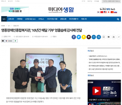 언론기사-영종장애인종합복지관,'10년간 매달 기부'엉클솝에 감사패 전달