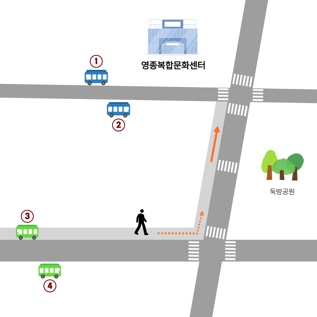 | 영종복합문화센터 | ① ② : 중구3, 중구5, 중구6-1, 중구9, 간선221 |